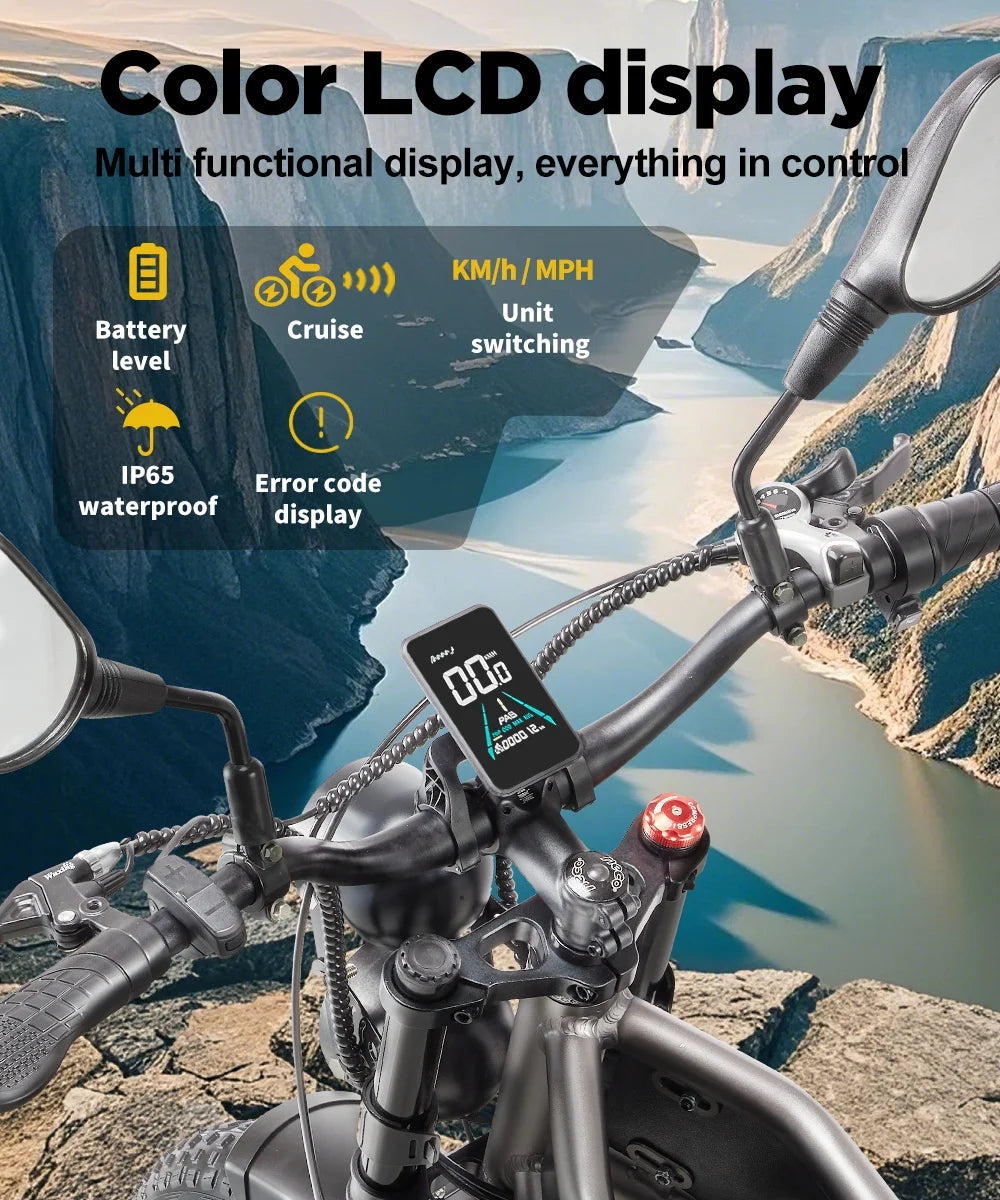 Leistungsstarkes Elektrofahrrad mit 48-V-Lithiumbatterie, bürstenlosem Motor und 20-Zoll-Rädern. Reichweite 31–60 km und Höchstgeschwindigkeit bis zu 50 km/h – perfekt für den täglichen Weg zur Arbeit und die Freizeit